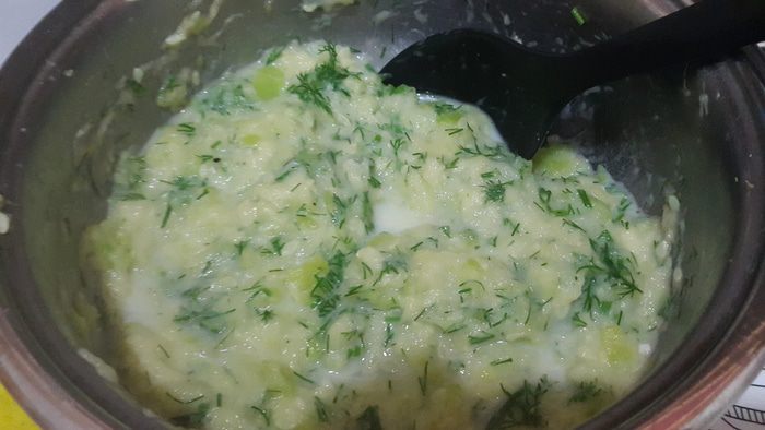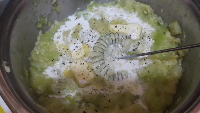 Слить воду с кабачков, добавить 2 ст. л. сливок, сливочное масло, поперчить и размять в пюре.