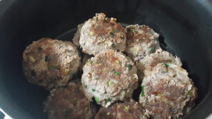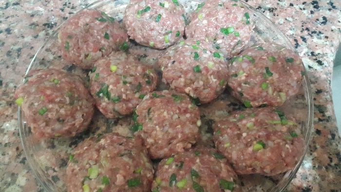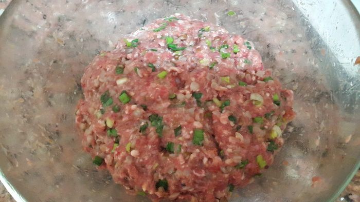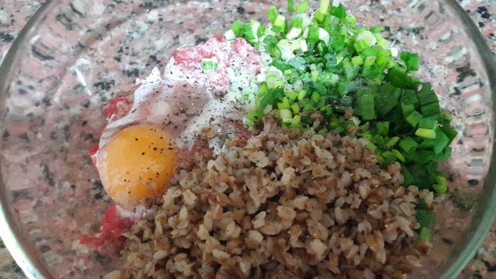 В фарш вбить яйцо, посолить, поперчить, добавить гречку, 2 ст. л. сливок и зеленый лук.