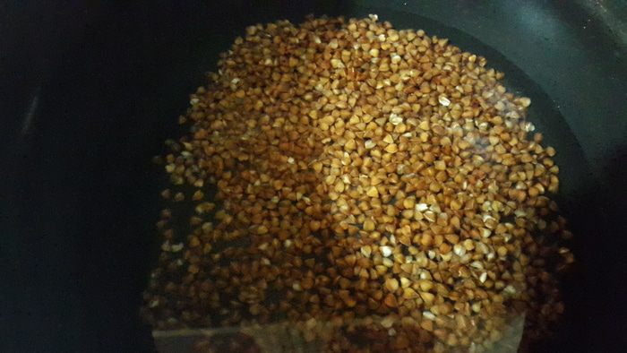 Гречку помыть, залить водой примерно на 0,7 см посолить и отварить до готовности. Остудить.