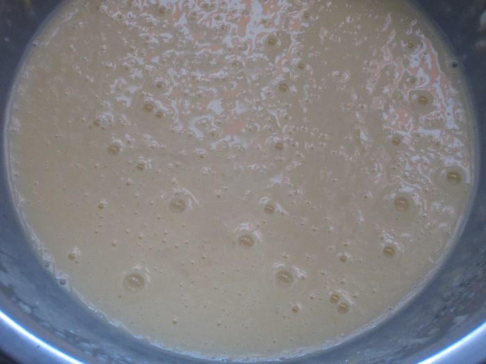 Сливочное масло растопить на водяной бане и добавить к полученной массе. Муку просеять с разрыхлителем и в несколько приёмов ввести в тесто.