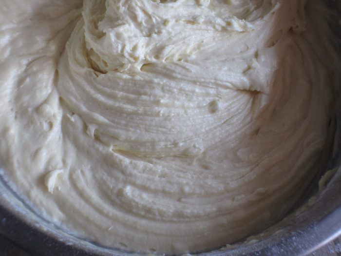 Соединить рикотту, яйца, йогурт, сахар, ром, соль, ванилин, сок и цедру лимона и хорошо взбить миксером до получения однородной массы.