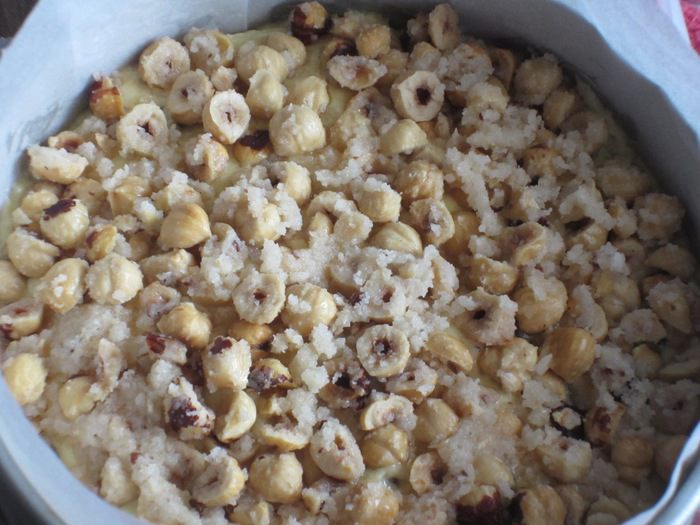 Тесто выложить в форму с пергаментом диаметром 20 см, сверху выложить фундук и выпекать в разогретой до 180 ° с духовке 25 минут, затем накрыть форму фольгой и выпекать ещё 35 минут (выпекать до сухой спички).