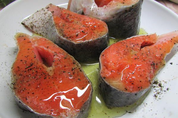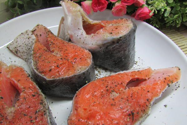 Стейки сёмги посолить и поперчить, сбрызнуть оливковым маслом.