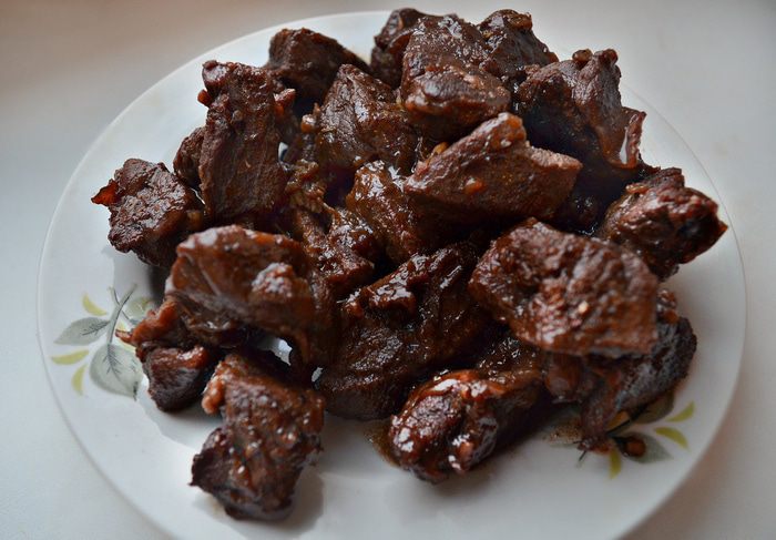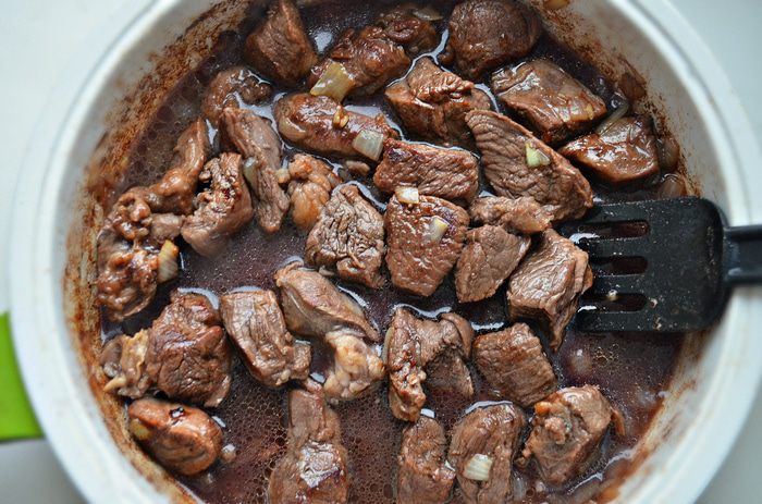 Снять сотейник с огня. Мясо выложить в другую посуду, дать остыть.