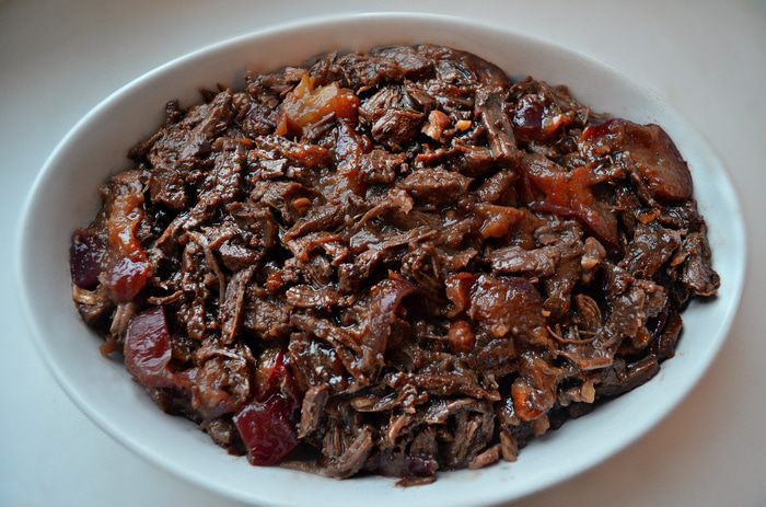 Если во время приготовления образовалось много жидкости, то необходимо немного уварить соус и перелить его к мясу (мне не пришлось этого делать). Мясо с соусом перемешать и разложить в форму для запекания или же в порционные формочки.