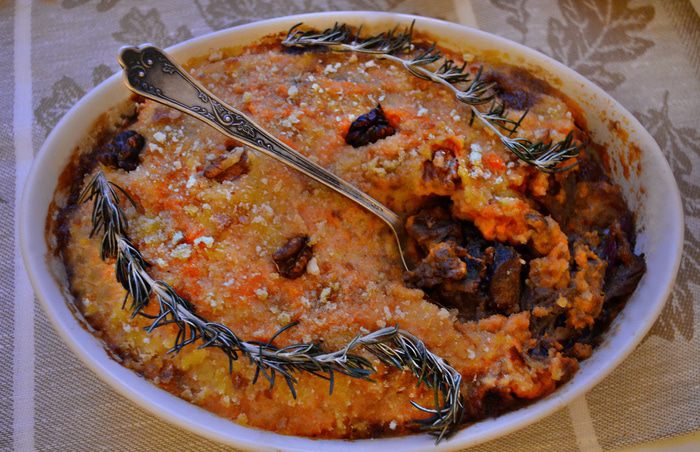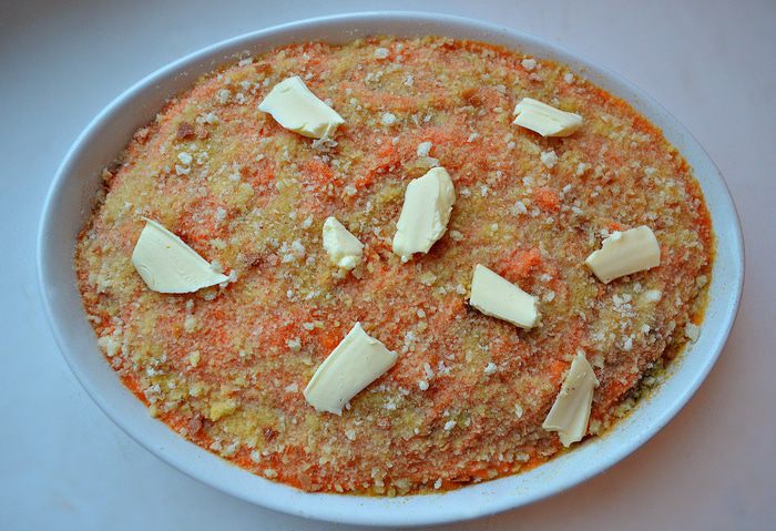 Выложить на мясо пюре из тыквы, посыпать панировочными сухарями и сверху разложить кусочками оставшееся сливочное масло. Запекать в разогретой до 180г духовке 20-25 мин.