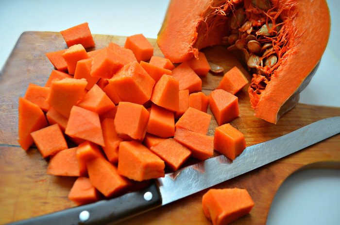 Тем временем очистить тыкву, нарезать кубиками и отварить в небольшом количестве подсоленной воды в течение 25-30 мин до размягчения.