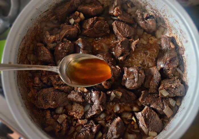 Влить к мясу 1 ст. л. мёда и дать слегка карамелизоваться (2 мин).