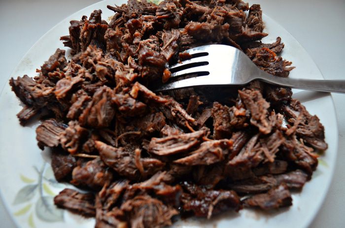 С помощью вилки разобрать мясо на волокна.