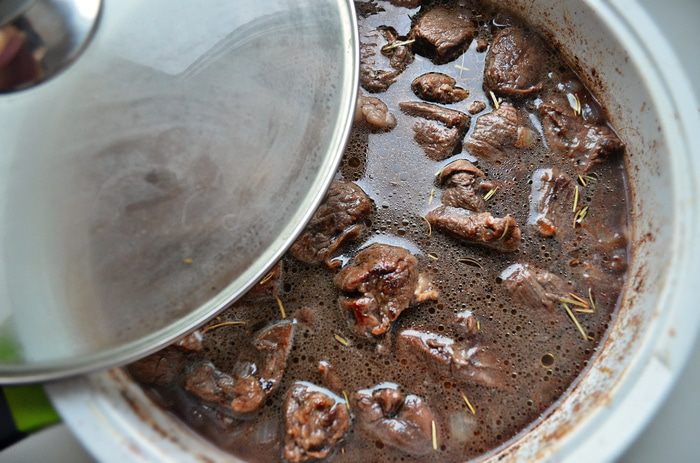 Затем добавить 1/2 ст воды, добавить розмарин, посолить и приправить перцем. Готовить под крышкой на медленном огне в течение 1 часа.