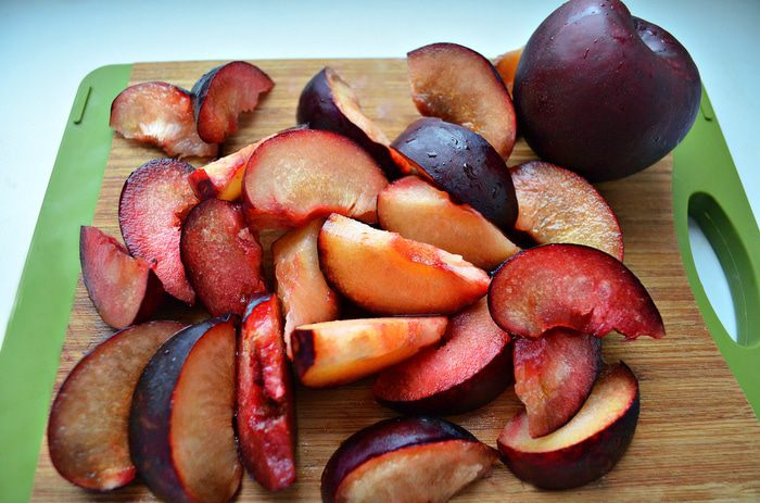 Из слив (нам понадобятся крупные сливы) удалить косточки и нарезать ломтиками.