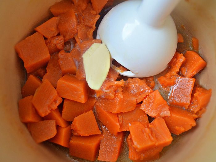 Затем слить жидкость, дать немного тыкве остыть, добавить 25 г сливочного масла и пюрировать с помощью блендера.