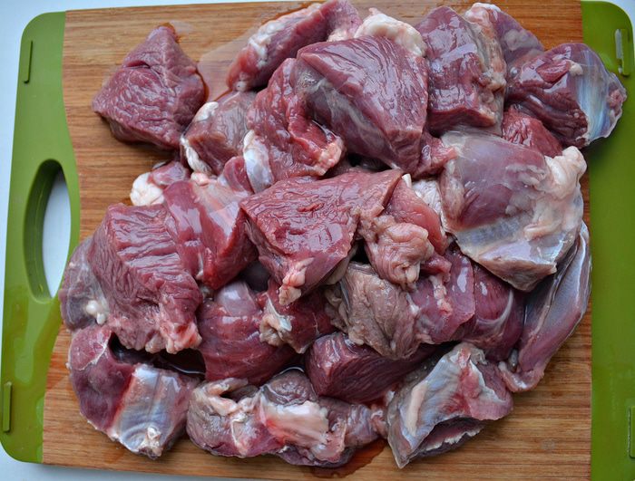 Мякоть баранины нарезать на крупные куски.