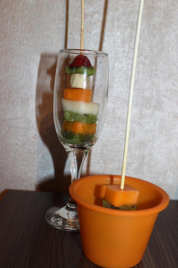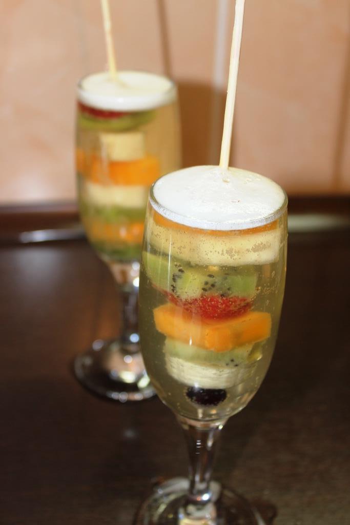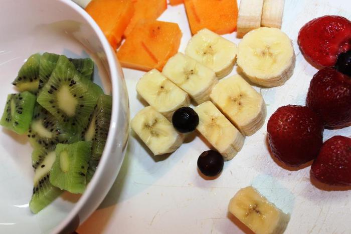Очищаем и нарезаем фрукты желаемого размера и формы, учитывая объем ваших форм (бокалов, креманок и т.д.).
