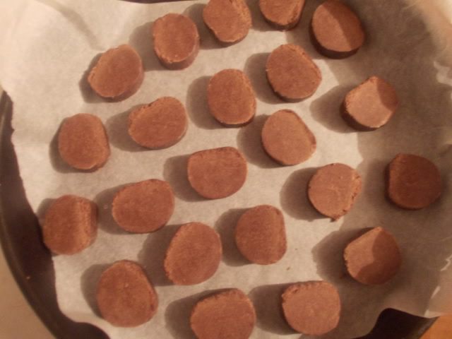 Затем поерзать ножом на колечки, около 1 см. Укладываем на противень с пергаментом и отправляем в разогретую духовку 180 С на полчаса.