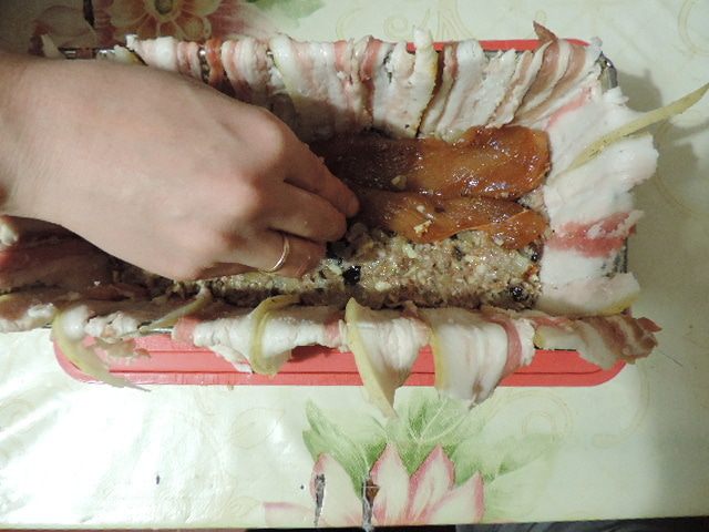 Кусочки выкладываем внахлест, чтоб они покрывали дно и стенки формы и немного свешивались вниз. Кстати, шкурку с сала можно срезать. Как видите, мы этого не сделали и ничуть об этом не пожалели.