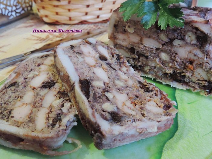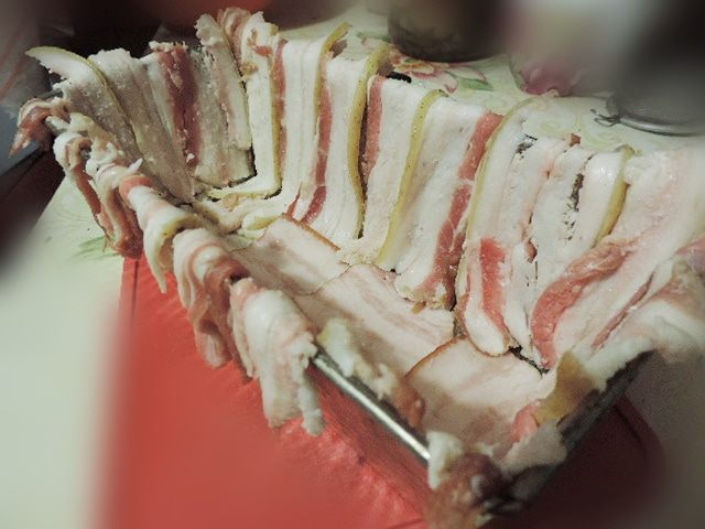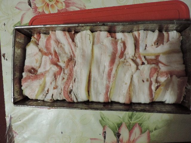 Теперь подготовим форму. Нам понадобиться вытянутая прямоугольная форма (у моей в сечении трапеция, а не прямоугольник). Чтоб облегчить себе жизнь, можно взять сырокопченый бекон в нарезке. У меня его не оказалось, пришлось достать из морозилки свиной подчеревок и нарезать тоненькими пластинками. Чтоб нарезать получилось тонко и аккуратно, подчеревок обязательно должен быть слегка подмороженным.