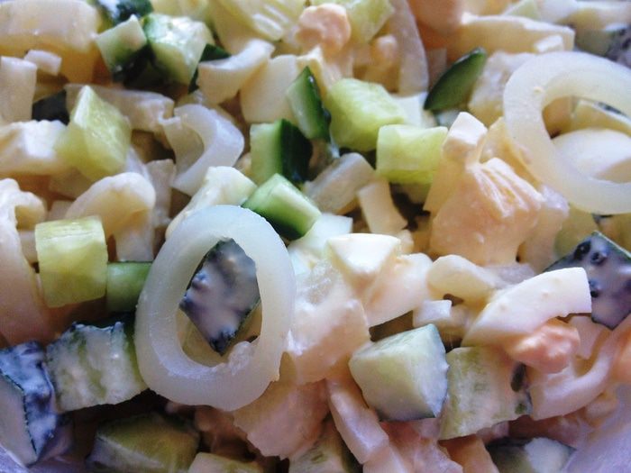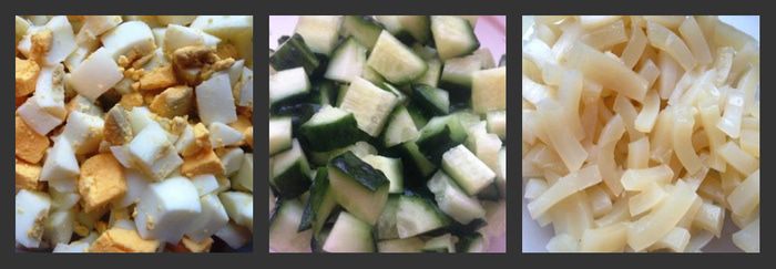 Огурцы, сваренные яйца и кальмаров нарезать кубиками.