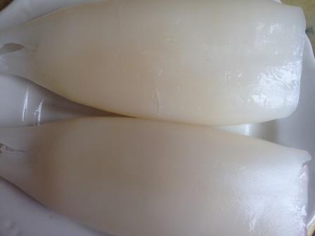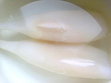 Почистить кальмаров (вытащить спинную хорду и снять верхнюю пленку).