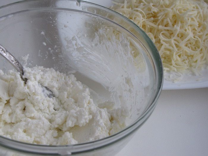 Пармезан натереть на терке. Фету размять вилкой.