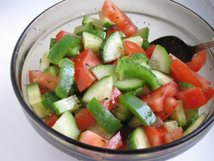 Овощи нарезать кусочками не слишком мелко, положить в миску, заправить и перемешать.