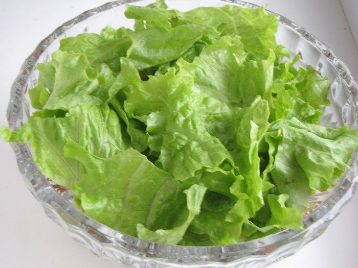 Выложить подготовленные овощи в салатник. Нарвать руками салатные листья и укрыть ими салат.