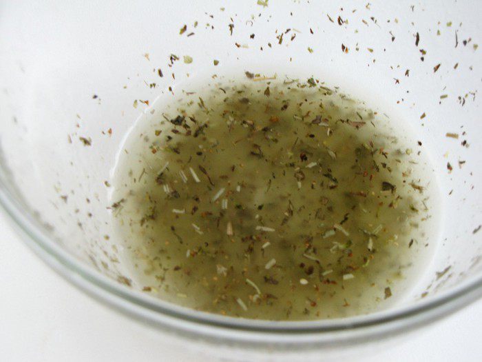 Сначала приготовим заправку. Смешать оливковое масло, лимонный сок, соль и ароматные травы. Можно взять прованские или итальянские с паприкой.
