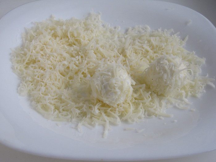 Влажными руками сформировать из феты шарики, обвалять их в тертом сыре.