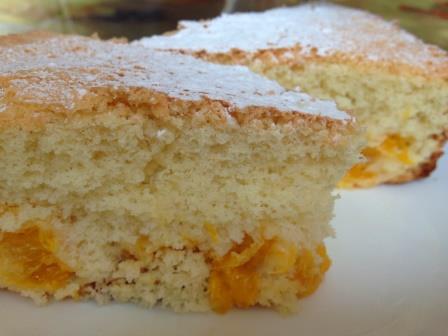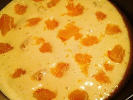 В проложенную пергаментом и смазанную маслом форму 24 см вылить треть теста, сверху выложить половину апельсинов, вылить вторую треть теста, распределить оставшиеся апельсины и покрыть остатками теста.