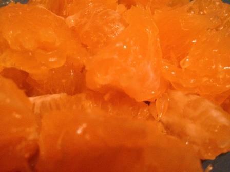 Апельсины очистить от кожуры и косточек, дольки очистить и разрезать на 2 части.