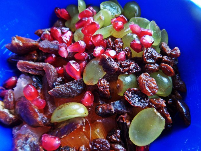 Если виноград крупный-разрезать пополам. Финики,курагу поделить на кусочки. Я их с ягодами годжи промыла в горячей воде,чтобы они слегка распарились.