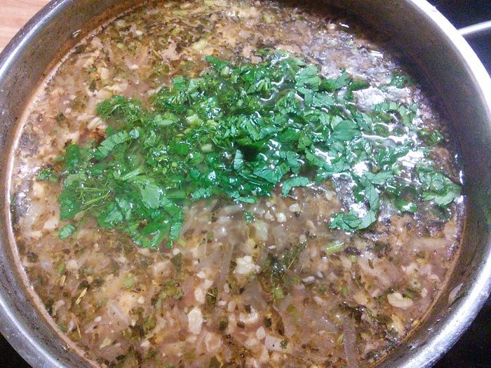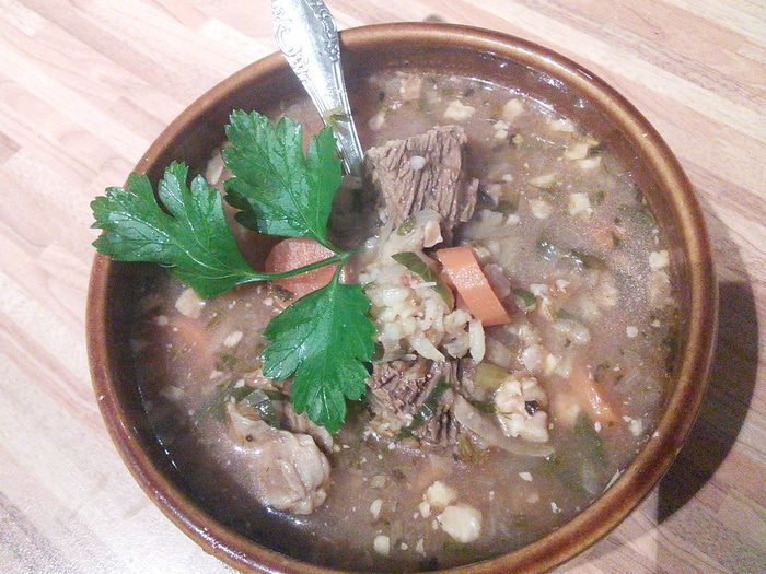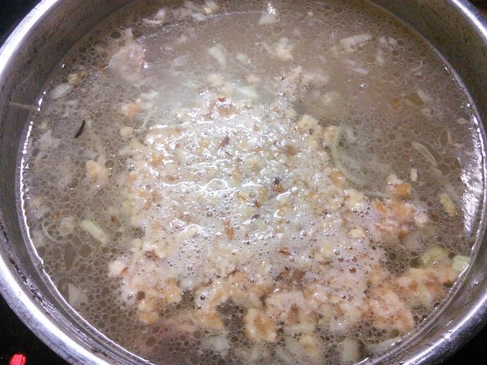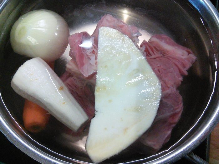 Итак, для начала порежем на порционные кусочки 1 кг. говяжьей грудинки с хрящиками, нальём в кастрюлю 3 л. воды и поставим варить, не забыв положить луковицу и суповые корнеплоды. После закипания тщательно снимаем пену, уменьшаем огонь и варим до почти-готовности мяса (около 1,5 часов). В общем, всё, как всегда.