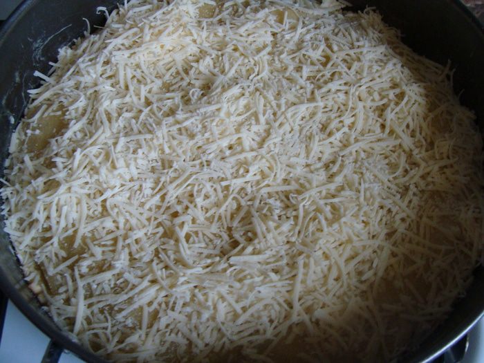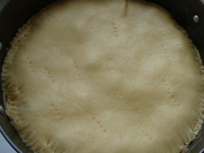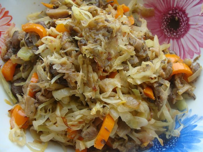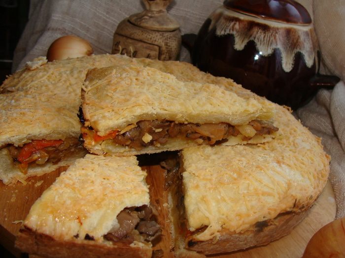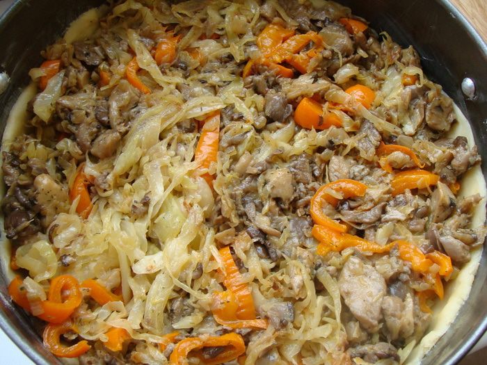 На раскаленную сковороду наливаем растительное масло. Высыпаем лук, обжариваем до прозрачности, затем добавляем мелко нарезанные грибочки, обжариваем до полуготовности. Затем добавляем болгарский перец, который предварительно измельчили квадратиками. В конце тушения добавляем сливочное масло. Начинка должна быть почти полностью готова, но не совсем, так как мы ее будем запекать.