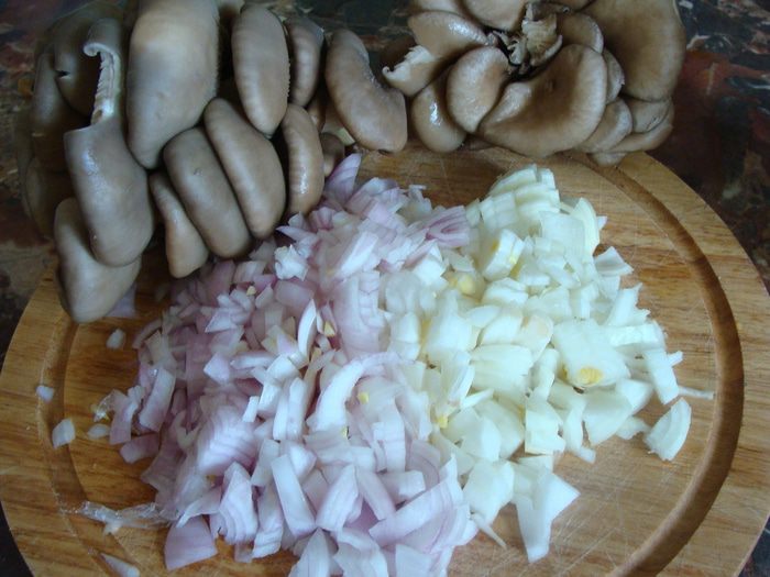 Пока тесто выстаивается, приготовим начинку. Для этого измельчаем лук. Вешенку моем, даем стечь.