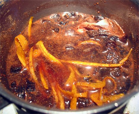 Чернослив положить в кастрюльку, добавить к нему специи, цедру апельсина и залить вином. Поставить кастрюльку на средний огонь и варить пока чернослив не станет мягким (если будет необходимо подливать вино).
