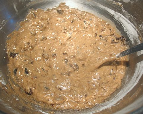В муку добавить чернослив и замесить тестом. Белок взбить до устойчивых пиков и аккуратно вести в тесто.