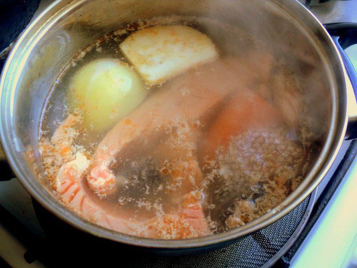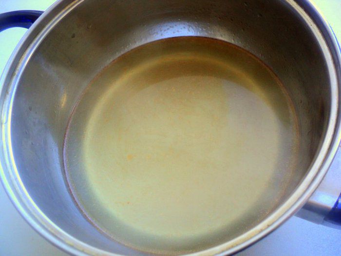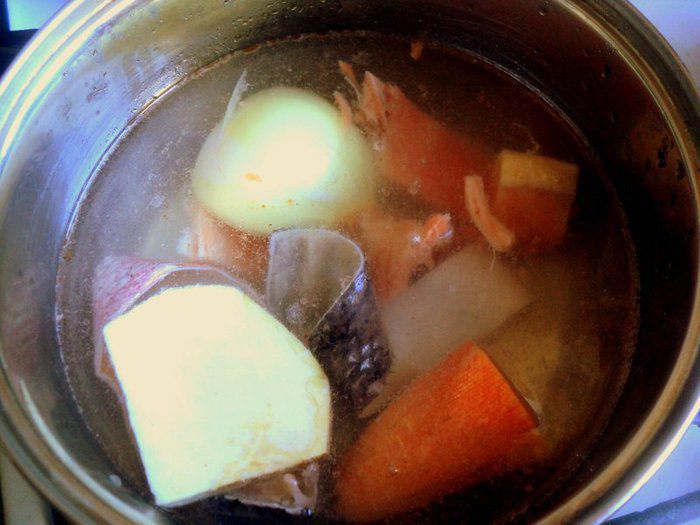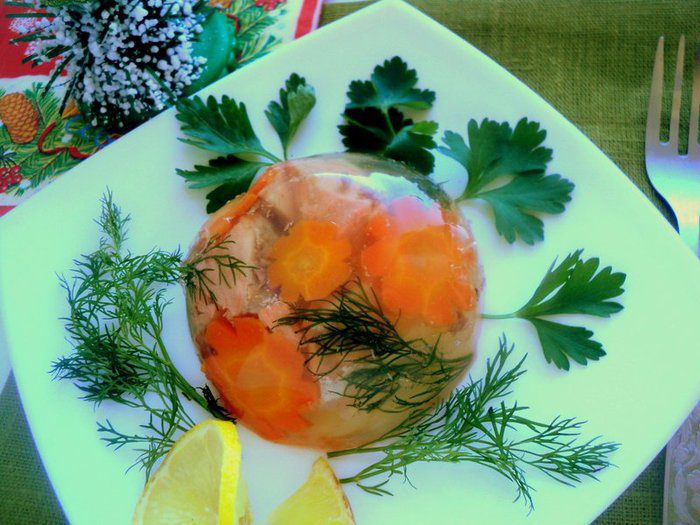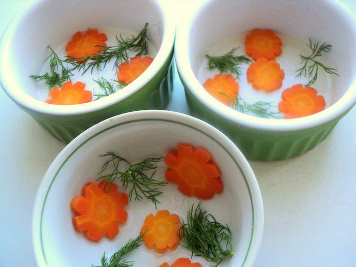 Из бульона убрать лук, сельдерей, лавровый лист, кости, кожу и обрезь. Вареную морковку оставить для украшения. Процедить бульон через 4 слоя марли. Добавить в набухший желатин 100 мл горячего бульона и размешать до его растворения, соединить с остальным бульоном. Охладить.