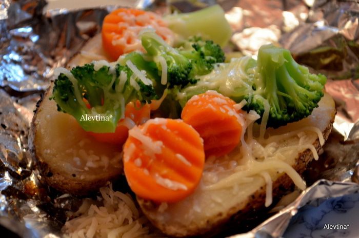 Замороженные овощи кладем в воду и отправляем на несколько минут в СВЧ или делаем как написано на упаковке, время зависит от кол-ва овощей. У меня заняло 3 мин. Картофель достанем из духовки, осторожно раскроем фольгу, разрежем каждый картофель напополам,выложим сверху масло сливочное по 1 ст.л, соль и перец, овощи теплые,сыр . Приятного аппетита.