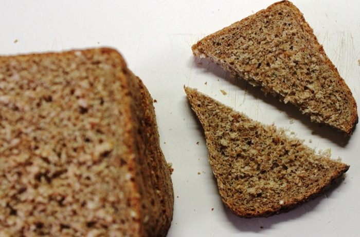 Берем какой-нибудь полезный хлебушек (у меня цельнозерновой с отрубями) и нарезаем тонкими ломтиками. А еще лучше взять уже нарезанный. Разрезаем ломтики пополам и отправляем в разогретую до 200 градусов духовку минут на 10 подсушиться.