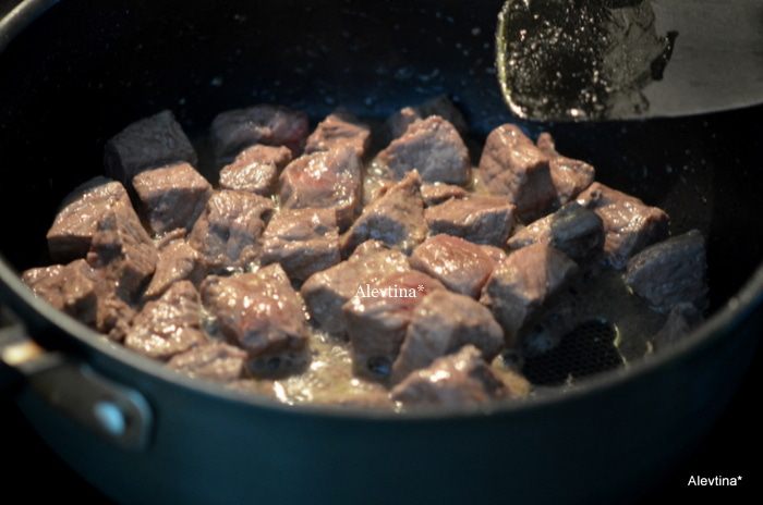 Говядину посолить и поперчить. Обжарить говядину на горячей сковороде с растительным маслом до коричневого цвета.