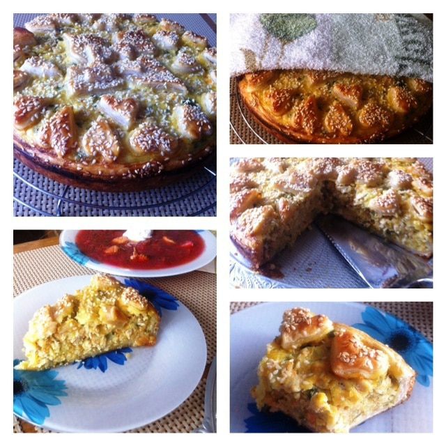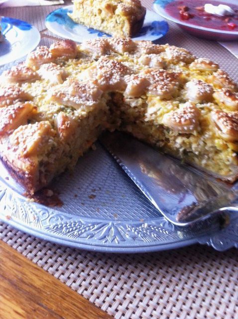 Отправляем пирог в разогретую духовку до 180С на 35-40 минут. Следим за своей духовкой, я накрывала фольгой, чтобы не сгорел кунжут.