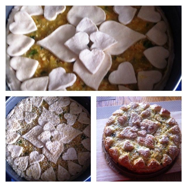 Выкладываем нашу начинку, разравниваем и сверху украшаем по желанию, либо еще пласт теста, либо вырезаем полоски и укладываем по диагонали (у кого на что хватит фантазии). В моем случае пирог подавался на обед 14 февраля, я вырезала сердечки :)