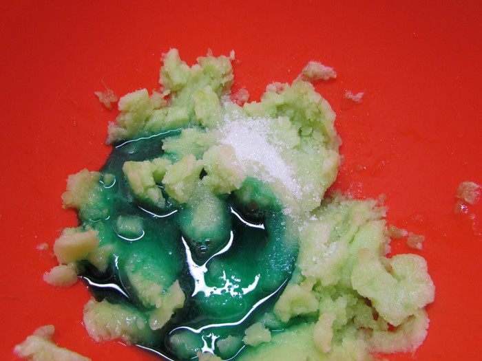 Добавить сахар и мятный сироп. Хорошо все перемешать.