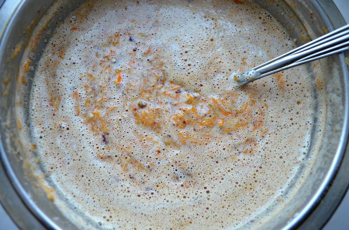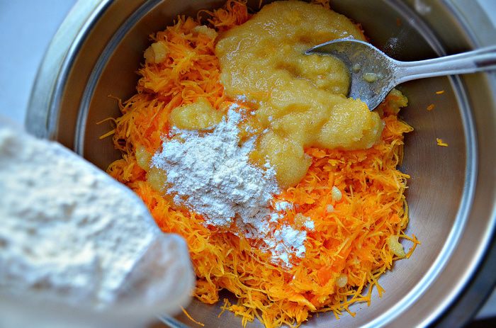 Смешайте муку с разрыхлителем и добавьте в тыквенную массу.