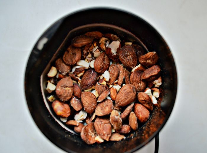 Миндаль измельчите в измельчителе или кофемолке (но не в муку, лучше, если останутся небольшие кусочки).