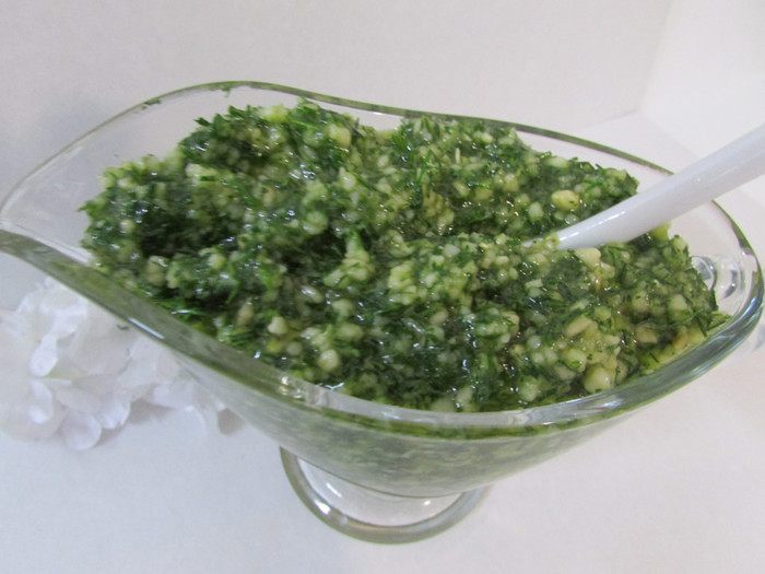 Приготовить соус песто. Зелень укропа помыть и хорошо обсушить. Мелко нарезать.
