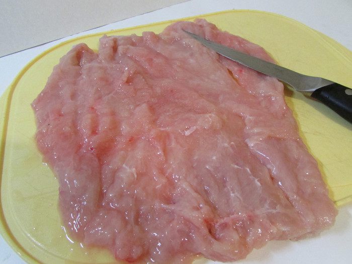 Филе индейки помыть, хорошо обсушить бумажным полотенцем. Затем выложить филе на доску и разрезать вдоль по горизонтали, не прорезая до конца, и развернуть, чтобы получилась ровная пластина.