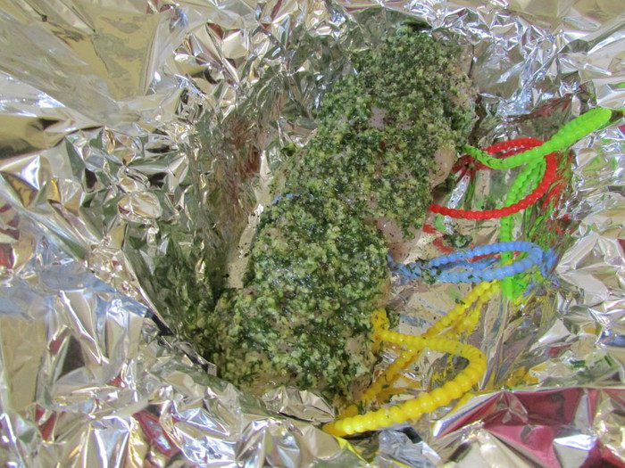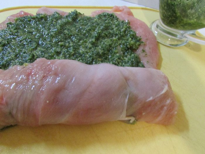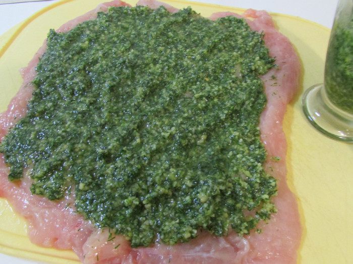 На подготовленное филе выложить третью часть соуса песто, разровнять ровным слоем.
