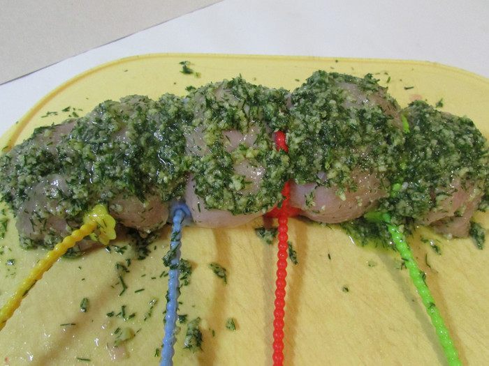 Перевязать рулет пищевым шпагатом (у меня силиконовые жгутики). Сверху рулет смазать оставшимся соусом.