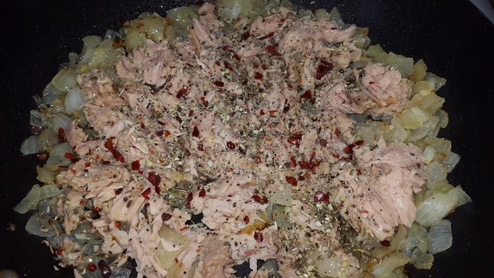 К луку с чесноком добавляем тунец, солим, перчим, посыпаем травами, перемешиваем и прогреваем 2-3 минуты.